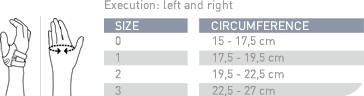 Dla zapewnienia pełnej skuteczności orteza występuje w wersji na lewą lub prawą dłoń oraz w kilku rozmiarach. Aby wybrać właściwy, należy zmierzyć obwód dłoni poniżej stawów palców (na wysokości śródręcza).